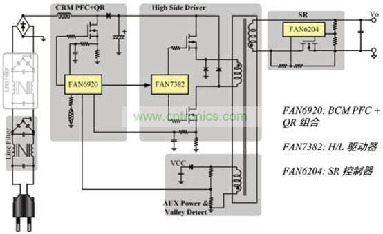 雙管反激解決方案分為三個(gè)部分,分別是FAN6920: BCM PFC + QR 組合;FAN7382: H/L 驅(qū)動(dòng)器;FAN6204: SR控制器,如圖1所示。