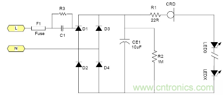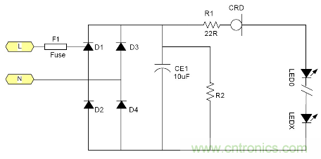 由于恒流二極管需要一定的電壓Vk才能夠進(jìn)入恒流, 所以太低的電源電壓是無(wú)法工作的。通常這個(gè)Vk大約在5-10V左右 所以大多數(shù)采用電池供電的LED是無(wú)法工作的, 最大電流由于恒流二極管的功耗受到限制, 所以過(guò)大的電流也是不合適的。例如1W的LED通常需要350mA, 恒流二極管就很難提供, 目前比較合適的使用場(chǎng)合就是交流市電供電的LED燈具采用很多小功率LED串聯(lián)也就是高壓小電流的情況是最為合適;但是由于恒流二極管的耐壓有一定的限制 所以它所能吸收的電源電壓變化也是有限的。就拿100V耐壓的CRD來(lái)說(shuō)用在220V市電電源里都還只能對(duì)付有限的電壓變化。220V經(jīng)過(guò)橋式整流以后它的輸出直流電壓大約為264V.如果市電變化+10% ~-15%就相當(dāng)于整流后為290~187V, 電壓變化103V.已經(jīng)超過(guò)其耐壓了。因?yàn)長(zhǎng)ED伏安特性的非線性 所以很難用公式來(lái)表示。總之當(dāng)市電電壓降低時(shí)LED中的電流就會(huì)隨市電電壓的降低而降低。其亮度也會(huì)跟著變。 典型應(yīng)用電路中圖3為典型的應(yīng)用電路, 圖4為加了阻容降壓的應(yīng)用電路為了應(yīng)對(duì)低電壓的輸出場(chǎng)合。