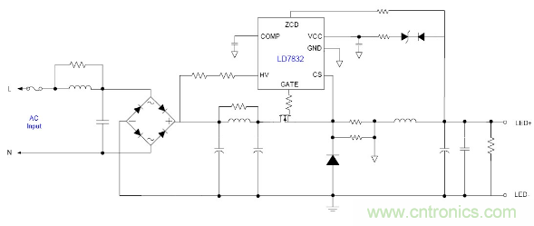 隨著目前法規(guī)和能效的需求, 針對(duì)LED應(yīng)用提出高PF以及適應(yīng)全電壓范圍都能可靠工作的要求, 并且朝小型化方面發(fā)展, 因此之前的填谷式的PFC電路也需要增加兩個(gè)高壓電容因體積的限制不太適合應(yīng)用。有鑒如此, 國(guó)內(nèi)外很多廠商都推出了適應(yīng)球泡燈和T管之類的非隔離電源應(yīng)用驅(qū)動(dòng)方案, 下面就以通嘉科技的LD7832做為典型介紹。