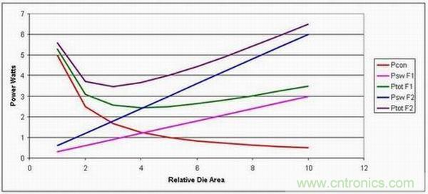 但是,在更高的工作頻率下,最佳裸片面積較小,從而帶來成本節(jié)約。實(shí)際上,在低頻率下,通過調(diào)整裸片面積來最小化損耗會帶來極高成本的設(shè)計(jì)。但是,轉(zhuǎn)到更高工作頻率后,我們就可以優(yōu)化裸片面積來降低損耗,從而縮小電源的半導(dǎo)體體積。這樣做的缺點(diǎn)是,如果我們不改進(jìn)半導(dǎo)體技術(shù),那么電源效率將會降低。