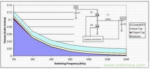 圖1顯示的是降壓電源頻率與體積的關(guān)系。頻率為100 kHz時(shí),電感占據(jù)了電源體積的大部分(深藍(lán)色區(qū)域)。如果我們假設(shè)電感體積與其能量相關(guān),那么其體積縮小將與頻率成正比例關(guān)系。由于某種頻率下電感的磁芯損耗會極大增高并限制尺寸的進(jìn)一步縮小,因此在此情況下上述假設(shè)就不容樂觀了。如果該設(shè)計(jì)使用陶瓷電容,那么輸出電容體積(褐色區(qū)域)便會隨頻率縮小,即所需電容降低。另一方面,之所以通常會選用輸入電容,是因?yàn)槠渚哂屑y波電流額定值。該額定值不會隨頻率而明顯變化,因此其體積(黃色區(qū)域)往往可以保持恒定。另外,電源的半導(dǎo)體部分不會隨頻率而變化。這樣,由于低頻開關(guān),無源器件會占據(jù)電源體積的大部分。當(dāng)我們轉(zhuǎn)到高工作頻率時(shí),半導(dǎo)體(即半導(dǎo)體體積,淡藍(lán)色區(qū)域)開始占據(jù)較大的空間比例。