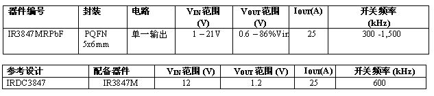 IR3847采用纖巧的PQFN 5×6mm 封裝,為15A 至 25A應(yīng)用帶來(lái)市場(chǎng)領(lǐng)先的電氣性能和熱性能,比如可以實(shí)現(xiàn)超過(guò)96%的尖峰效率,在25A下溫度僅上升50°C等。新器件的其它增強(qiáng)性能還包括外同步、排序、VTT跟蹤和輸出電壓極限。