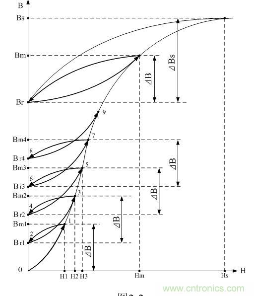 (2-9)式中,ΔB為磁感應(yīng)強(qiáng)度增量。由于輸入脈沖的幅度U和寬度τ分別與磁感應(yīng)強(qiáng)度增量ΔB和磁場強(qiáng)度增量ΔH的大小相對應(yīng),只要作用于開關(guān)變壓器線圈上的脈沖電壓的幅度U和脈沖寬度τ不變,則流過變壓器次級線圈回路中的電流也不變,這只是在導(dǎo)磁率為常數(shù)的情況下;但由于導(dǎo)磁率不是一個(gè)常數(shù),即變壓器鐵芯磁化曲線的非線性,致使經(jīng)過若干個(gè)脈沖序列之后,開關(guān)變壓器鐵芯中的最大磁感應(yīng)強(qiáng)度 和剩磁 就會相對穩(wěn)定在某個(gè)值上。此時(shí)剩磁 對應(yīng)每個(gè)輸入直流脈沖的起點(diǎn)(0電壓),而最大磁感應(yīng)強(qiáng)度 對應(yīng)每個(gè)直流脈沖的終點(diǎn)(電壓最大值)。