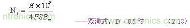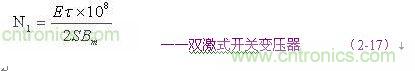 (2-17)和(2-18)式,為計算雙激式開關(guān)變壓器初級線圈N1繞組匝數(shù)的公式。式中,N1為變壓器初級線圈N1繞組的最少匝數(shù),S為變壓器鐵芯的導(dǎo)磁面積(單位:平方厘米),Bm為變壓器鐵芯的最大磁感應(yīng)強度(單位:高斯),τ為脈沖寬度,或電源開關(guān)管的導(dǎo)通時間(單位:秒),E為脈沖電壓的幅度,單位為伏,F(xiàn)為開關(guān)電源的工作頻率,單位赫芝。