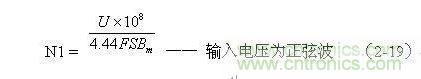 (2-19)式為計算正弦波電源變壓器初級線圈N1繞組匝數(shù)的公式。式中,N1為變壓器初級線圈N1繞組的最少匝數(shù),S為變壓器鐵芯的導(dǎo)磁面積(單位:平方厘米),Bm為變壓器鐵芯的最大磁感應(yīng)強度(單位:高斯),U為正弦波輸入電壓有效值,單位為伏,F(xiàn)為正弦波的頻率,單位赫芝。