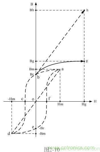 在圖2-10中,虛線表示的磁化曲線a-b-c-d-e-f-a為雙激開關(guān)變壓器鐵芯正常工作時的磁滯回線,虛線線段d-a是把開關(guān)變壓器鐵芯的磁化曲線理想化后得到的一條曲線(直線),理想磁化曲線是一條斜率等于最大磁感應(yīng)強度增量與最大磁場強度增量之比,且經(jīng)過坐標原點的直線;當直線不經(jīng)過坐標原點時,這條直線可稱為等效磁化曲線(如線段bh)。理想磁化曲線只有一條,但等效磁化曲線卻有無數(shù)多條,且每條效磁化曲線均與理想磁化曲線平行。