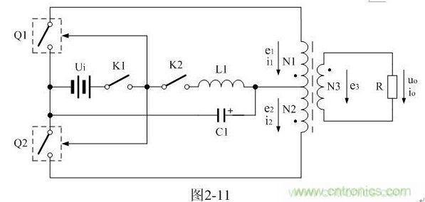 在圖2-11中,開機時,驅(qū)動電路電源開關(guān)K1首先接通,電源Ui首先給電源開關(guān)管Q1、Q2的驅(qū)動電路加電;然后開關(guān)管電源開關(guān)K2接通,由于L1的作用,C1兩端的電壓只能緩慢上升,以保證加到變壓器初級線圈的電壓不會突然升高,使流過變壓器初級線圈的電流過大,導(dǎo)致變壓器鐵芯出現(xiàn)飽和;關(guān)機時,開關(guān)管電源開關(guān)K2首先關(guān)斷,而后驅(qū)動電路電源開關(guān)K1再關(guān)斷,由于C1兩端的電壓緩慢下降,使變壓器鐵芯可進行充分退磁,以保證下次開機的時候,變壓器鐵芯磁滯回線的初始相位總是從0開始。