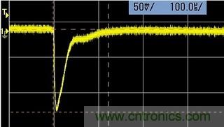 這是任何電源都存在的正?,F(xiàn)象。當(dāng)負(fù)載吸收電流發(fā)生跳變的瞬間,就會造成電源輸出端的電壓瞬間偏離設(shè)定值。這個示波器屏幕的截圖(圖1),就是當(dāng)我的一個電源的負(fù)載電流,從1mA 瞬間變化到500mA時, 輸出電壓經(jīng)歷了約30uS 瞬間變化。