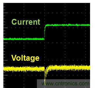 在加入電容后,對提升電路的瞬態(tài)響應(yīng)能力,往往會起到比較明顯的效果。如圖4所示的,我們在用一個通用電源測量GSM手機(jī)脈沖電流,在沒有并聯(lián)電容的時候,瞬間電源跌落會達(dá)到0.6V (見圖4左). 對于一個工作在3.8V的手機(jī)來說,這樣大的電源跌落足以造成手機(jī)自動關(guān)機(jī)。當(dāng)我們并聯(lián)了一個2000uF的電容后,電源跌落降到了0.2V以下,得到明顯改善,見圖4右所示(圖中,黃色曲線為電壓,綠色曲線為電流)。