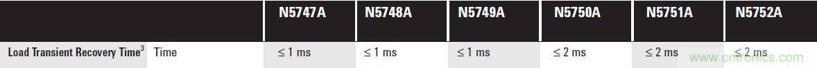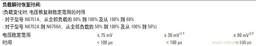 直流電源的瞬態(tài)響應(yīng)時間快慢和跌落的幅度不盡相同。例如,安捷倫N6705B直流電源分析儀中所用的高性能模塊N675xA, 瞬態(tài)響應(yīng)指標(biāo)如下: