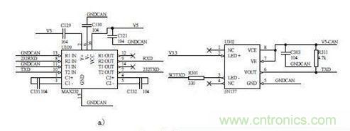 MAX232 是+5V電源的收發(fā)器,與計算機串口連接,實現(xiàn)RS-232接口信號和TTL 信號的電平轉(zhuǎn)換,使BMS 和PC 機能夠進行異步串行通訊。為了防止電磁干擾影響串口上數(shù)據(jù)的傳輸,必須對總線信號進行隔離。串口是單向傳輸,所以利用6N137光電耦合較為方便,圖 3b)所示為232TXD 信號光耦隔離電路。