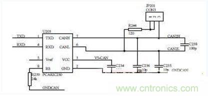 在電路中可根據(jù)整車要求,是否接入120Ω的終端電阻,當JP201跳線接1腳和2腳時,不接入電阻,當接2腳和3腳時,電阻接入。