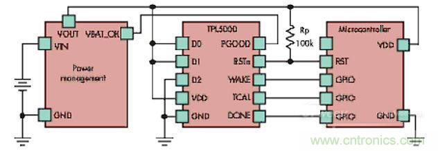 新式解決方案采用針對長休眠期特制的定時裝置,德州儀器TPL5000具備可編程分配器,提供最高間隔64秒的蘇醒脈沖,運作時用電量僅30nA,在極長休眠周期下,最多能為電池供電的無線傳感器延長兩年使用年限。(請見下圖)