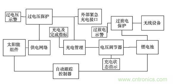 現(xiàn)有的光伏電池,單體的輸出電壓都很低(在1V 以下) ,本設(shè)計中,將多個光伏電池相串聯(lián),組成太陽能組件。通過可以自動調(diào)節(jié)占空比的供電網(wǎng)絡(luò)保證在光照強度變化和負載變化時,輸出電壓基本穩(wěn)定,為充電管理芯片提供穩(wěn)定的電壓輸入。通過對供電網(wǎng)絡(luò)的副邊電壓監(jiān)測,保護充電管理芯片不因電壓過高而損壞。通過對電池兩端的電壓監(jiān)測,保證鋰電池不會因過放電而損壞。由于無線示功儀及其中繼網(wǎng)絡(luò)節(jié)點的供電要求是313V,采用低噪聲、高速度的CMOS型電壓調(diào)節(jié)器。在自動跟蹤控制器作用下,始終保持全天候跟蹤太陽。為了防止因連續(xù)陰雨天而導致的太陽能供電不足,設(shè)計應(yīng)急充電電路,充電期間,無線示功儀及其節(jié)點正常運行。具體系統(tǒng)設(shè)計模塊如圖1 所示。