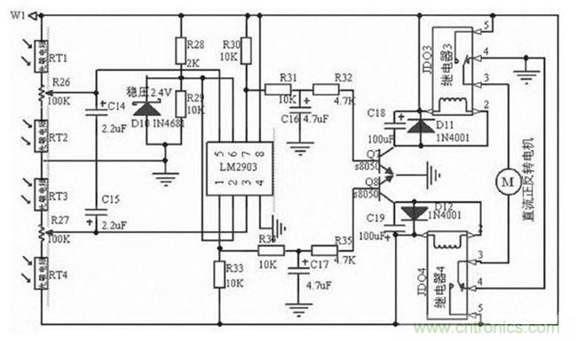 控制器的輸入端,光敏傳感器分別由兩只光敏電阻串聯(lián)交叉組合而成。每一組兩只光敏電阻中的一只為比較器的上偏置電阻,另一只為下偏置電阻。一只檢測太陽光照,另一只則檢測環(huán)境光照,送至比較器輸入端的比較電平始終為兩者光照之差。具體電路如圖4 所示:光敏電阻RT1 , RT2 與電位器R27 和光敏電阻RT3 , RT4 與電位器R28 分別構(gòu)成光敏傳感電路。將RT1 和RT3 安裝在垂直遮陽板的一側(cè), RT4 和RT2 安裝在另一側(cè)。當RT1 , RT2 , RT3 和RT4 同時受環(huán)境自然光線作用時,R27 和R28 的中心點電壓不變。當只有RT1 ,RT3 受太陽光照射, RT1 的內(nèi)阻減小, LM 2903 的5 腳電位升高, 7 腳輸出高電平, 三極管Q7 導通,JDQ 4 工作,其觸點3, 5 閉合。同時RT3 內(nèi)阻減小, LM 2903 的3 腳電位下降, JDQ 5 不工作,電機M 正轉(zhuǎn);當只有RT2 , RT4受太陽光照射,同理,電機M 反轉(zhuǎn)。當轉(zhuǎn)到垂直遮陽板兩側(cè)的光照度相同時,JDQ 4, JDQ 5 都導通,電機M 才停轉(zhuǎn)。在太陽不停地偏移過程中,垂直遮陽板兩側(cè)光照度的強弱不斷地交替變化,電機不停的運動,使太陽能接收裝置始終面朝太陽。