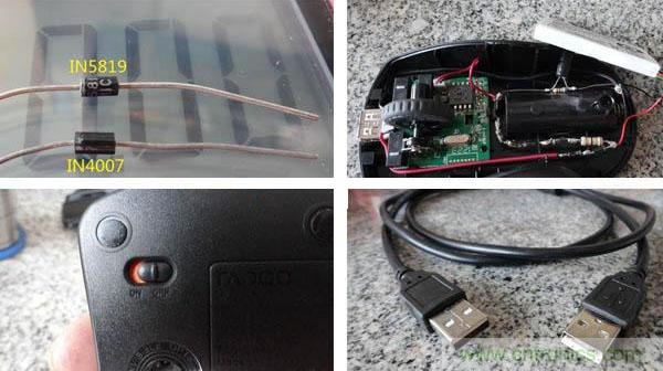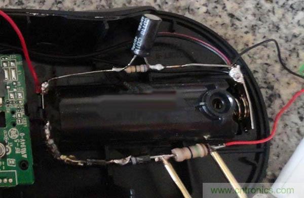 新加的鋰電正極通過(guò)15歐限流電阻和三個(gè)IN4007降壓,接到原電池正極,給鼠標(biāo)供電。