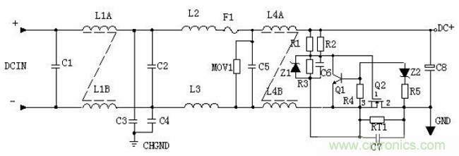 ② R1、R2、R3、Z1、C6、Q1、Z2、R4、R5、Q2、RT1、C7組成抗浪涌電路。在起機(jī)的瞬間,由于C6的存在Q2不導(dǎo)通,電流經(jīng)RT1構(gòu)成回路。當(dāng)C6上的電壓充至Z1的穩(wěn)壓值時(shí)Q2導(dǎo)通。如果C8漏電或后級(jí)電路短路現(xiàn)象,在起機(jī)的瞬間電流在RT1上產(chǎn)生的壓降增大,Q1導(dǎo)通使Q2沒(méi)有柵極電壓不導(dǎo)通,RT1將會(huì)在很短的時(shí)間燒毀,以保護(hù)后級(jí)電路。