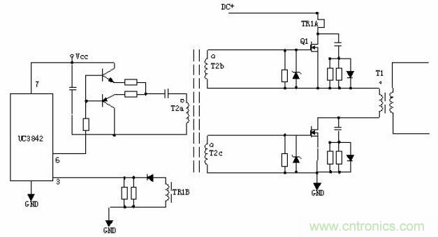 5、有驅(qū)動(dòng)變壓器的功率變換電路:T2為驅(qū)動(dòng)變壓器,T1為開(kāi)關(guān)變壓器,TR1為電流環(huán)。