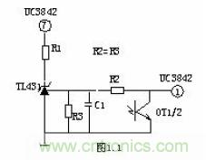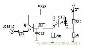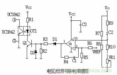 當(dāng)輸出U0升高,經(jīng)取樣電阻R7、R8、R10、VR1分壓后,U1③腳電壓升高,當(dāng)其超過(guò)U1②腳基準(zhǔn)電壓后U1①腳輸出高電平,使Q1導(dǎo)通,光耦OT1發(fā)光二極管發(fā)光,光電三極管導(dǎo)通,UC3842①腳電位相應(yīng)變低,從而改變U1⑥腳輸出占空比減小,U0降低。