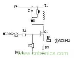 當(dāng)輸出電路短路或過(guò)流,變壓器原邊電流增大,R3 兩端電壓降增大,③腳電壓升高,UC3842⑥腳輸出占空 比逐漸增大,③腳電壓超過(guò)1V時(shí),UC3842關(guān)閉無(wú)輸出。