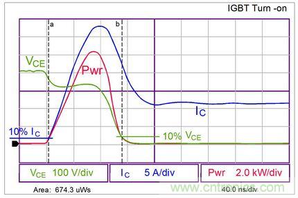 導(dǎo)通時,應(yīng)當(dāng)量測起于IC電平10%終于10% VCE點的損耗。這些電平等級相當(dāng)標(biāo)準(zhǔn),雖然這樣說也有些主觀性。如果需要的話,也可以使用其他點。無論選擇何種電平來量測不同間隔,重要的是保持一致,使從不同 組件獲取的數(shù)據(jù)能夠根據(jù)相同的條件來比較。功率根據(jù)示波器波形來計算。由于它并非恒定不變,且要求平均功率,就必須計算電源波形的積分,如波形跡線的底部 所示,本案例中為674.3 μW(或焦耳)。