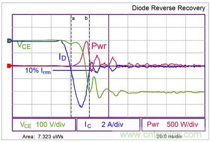 一般而言,在電壓波形的峰值,IGBT將導(dǎo)電,而二極管不導(dǎo)電。為了量測二極管損耗,要求像電機(jī)這樣的無功負(fù)載,且需要捕獲電流處于無功狀態(tài)(如被饋送回電源)時的波形。
