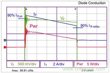 必須獲取在開關(guān)周期的部分時段(此時電流為無功模式使二極管導(dǎo)電)時的二極管導(dǎo)通損耗資料。通常量測峰值、負(fù)及反向?qū)щ婋娏?0%點的資料。