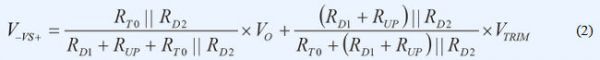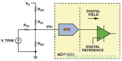 VS+引腳上的正常工作電壓為1V。若 VTRIM為1V左右且RT0遠大于RD2,則可忽略電路的其余分支部分。復(fù)合網(wǎng)絡(luò)用作簡單分壓器,并調(diào)節(jié)RUP電阻值,提供類似于模擬控制器的特性,實現(xiàn)了模擬電源模塊中的電壓向上調(diào)整。