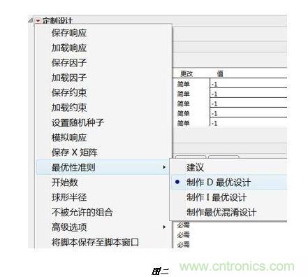 篩選設(shè)計是指在問題研究的早期,潛在的候選因素很多,如何有效地大規(guī)模降低實驗次數(shù)而又準確地找到少數(shù)幾個影響發(fā)動機性能的關(guān)鍵因素。具體的實現(xiàn)手段有兩種:一種是經(jīng)典的實驗設(shè)計方法,如部分析因設(shè)計、Plackett-Burman設(shè)計等(如圖一所示);另一種是高級的實驗設(shè)計方法,如D最優(yōu)設(shè)計等(如圖二所示)。