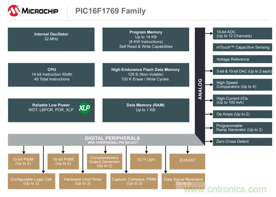 PIC16F1769系列集成了多個智能模擬和數(shù)字外設(shè),包括三態(tài)