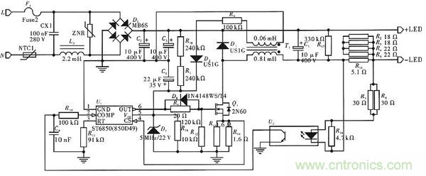 LED節(jié)能燈的快速發(fā)展,使得LED驅(qū)動電路的設(shè)計更加嚴(yán)格,整個電路不僅要安全低功耗,還應(yīng)該具有恒流特性,即電源電壓變動幅度<15%時,輸出電流的變化幅度不超過10%,這樣才能保證LED驅(qū)動電路較高的能量利用效率。
