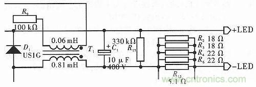 如圖2所示,此電路通過變壓器輸出適當(dāng)?shù)碾娏?,?dāng)有LED負(fù)載時,電路中通入適當(dāng)?shù)碾娏骱皖l率使LED正常工作;當(dāng)沒有負(fù)載時,變壓器中仍然殘留有能量,需要釋放。此時由R17等構(gòu)成的回路,可以慢慢地釋放變壓器中的電能。但當(dāng)電流突然減小時,變壓器中會產(chǎn)生感應(yīng)電動勢,由此會產(chǎn)生較高的反向電壓,可能會擊穿器件。為了克服這個問題,在線圈的兩端并聯(lián)一個續(xù)流二極管D1,同時在電路輸出端串聯(lián)R15,并且在R15兩端并聯(lián)R2,R3,R4,R6。R15有降壓作用,并且能為反饋電路提供電壓。由于R15承受的功率較大,容易燒壞,所以預(yù)備一個由R2,R3,R4和R6的并聯(lián)等效電阻,這樣每個電阻承受的功率變小,在增加使用壽命的同時,能夠減少維修費(fèi)用。