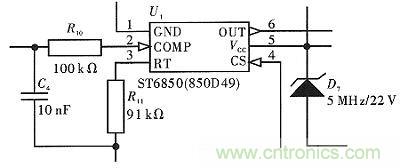 如圖4所示,電路通過T1、D7獲取穩(wěn)定的22 V電壓,供給芯片工作,芯片通過2號引腳進(jìn)行取樣輸入,C4對電路的頻率和電壓進(jìn)行控制。