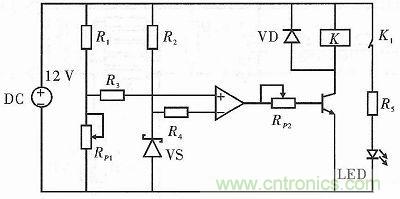 合理的蓄電池充放電,不僅可以延長蓄電池壽命,且能提升整個電路系統(tǒng)的穩(wěn)定性。因此需要設(shè)計保護(hù)電路,以保證蓄電池能在一定的電壓范圍內(nèi)進(jìn)行充放電。本項目使用3級級聯(lián)的12 V鉛酸蓄電池。由于過充電路與過放電路有相似性,本文只給出蓄電池的過放電路,如圖5所示。電源電壓正常時,調(diào)節(jié)電位器RP1使放大器的同相輸入端的電位略高于反相輸入端的電位,此時放大器輸出低電平,VT截止,電路正常工作。當(dāng)電源電壓<10.5 V時,反相輸入端的電位大于同相輸入端的電位,放大器會輸出高電平,調(diào)節(jié)RP2,使VT導(dǎo)通,此時負(fù)載與電源斷開。