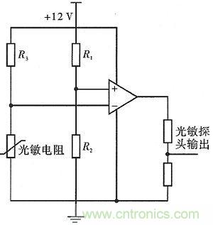 其由光電轉(zhuǎn)換模塊和光敏電阻組成。光電轉(zhuǎn)換由比較器來實現(xiàn)。當(dāng)光敏探頭感應(yīng)的光照強(qiáng)度不強(qiáng)時,比較器會輸出高電位,否則輸出低電位。具體電路如圖6所示。R1分擔(dān)電路電壓,依照外界環(huán)境條件,選擇適當(dāng)?shù)碾娮鑂2,控制比較器中正相輸入的電壓值,使其作為比較器工作的參考電壓;R3起到保護(hù)光敏電阻以及分壓的作用。光敏電阻的阻值隨著外界光強(qiáng)的變化而變化,這樣就可將光信號變換成電壓信號,以此作為信號電壓連接到比較器的反相輸入端。比較兩個輸入端的電壓大小。若信號電壓較小,比較器輸出高電平,否則比較器輸出低電平。從而實現(xiàn)在明亮條件下輸出低電平,在黑暗條件下輸出高電平的設(shè)計要求。