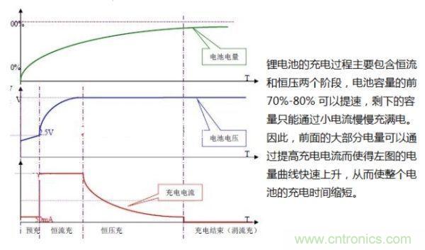 隨著對鋰電池容量的要求越來越高,鋰電池廠家也在加快新型電池的研發(fā),額定充電電壓從傳統(tǒng)的4.2V提高到4.35V,目前又出現(xiàn)了4.4V充電電壓的鋰電池,容量進一步提高。而傳統(tǒng)的充電器輸出電壓為5V,充電控制電路會調(diào)節(jié)充電電壓和電流滿足鋰電池的充電特性。不同鋰電池的化學特性不同,因此充放電性能及安全性能也就不同,有的電池芯適合大電流充放電,而有些電池芯可以耐高電壓,所以,采用何種快速充電方式要取決于鋰電池芯的具體特性。提高充電器的輸出電壓可以在恒流階段提高充電功率,實現(xiàn)快速充電。