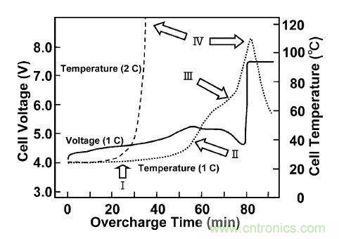 下圖是鋰離子電池過充電測試的一個事例??梢钥闯龀潆娺^程中鋰離子電池芯內(nèi)部溫度和電壓的變化情況,正常1C充電時,電池芯的溫度隨恒流充電慢慢升高,而隨恒壓階段電流減小慢慢降低,整個過程溫度可控,安全。當大電流(2C或以上)時,電池芯內(nèi)部反應劇烈發(fā)生熱失控,溫度急劇升高而發(fā)生起火或爆炸。