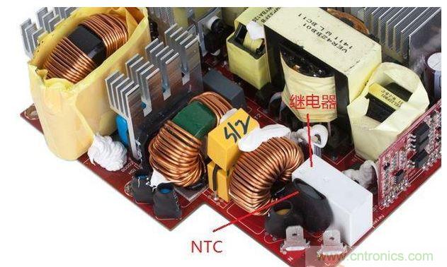 繼電器。安裝在這里的NTC的作用也是抑制電源接通瞬間的浪涌電流,保護(hù)電子設(shè)備。原理簡而言之就是“阻值隨溫度升高而降低”。舉個(gè)例子,假設(shè)上圖電源的NTC在“零電流通過/零功率”狀態(tài)下的阻值為20歐,當(dāng)機(jī)器冷啟動時(shí),瞬態(tài)電流讓NTC阻值急速下降至低于1歐,隨著后續(xù)持續(xù)電流的輸入,NTC持續(xù)發(fā)熱,維持在低阻值,功耗極低。