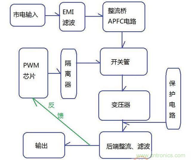 圖1是一個(gè)典型的雙管正激拓?fù)浣Y(jié)構(gòu),肖特基整流、單路磁放大穩(wěn)壓,由CWT代工。1是EMI濾波電路。2主要是APFC(主動式功率因數(shù)校正),主要包括整流橋、主動PFC電感和升壓電容、PWM芯片。3主要包括變壓器和磁放大電感、待機(jī)驅(qū)動芯片。4是后端整流,二次側(cè)(輸出端)電路。兩條散熱片上,2和3間釘著開關(guān)管,3和4間釘著整流管。圖上沒框住的還有三顆光耦,沒特意標(biāo)出的有保護(hù)電路、輸出線材、背部元件、電路板等。大體示意圖表示如圖2: