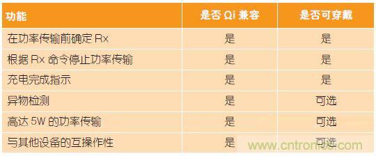 大多數(shù)Qi兼容功能的使用并不影響尺寸或性能。異物檢測(FOD)功能是一項可選功能,可防止功率傳輸?shù)匠潆妳^(qū)的雜散金屬物體。在具有FOD功能的低功耗系統(tǒng)中,總輸出功率被減小50%以上。隨著充電區(qū)域的縮小,物體進入該區(qū)域,并被加熱至出現(xiàn)問題的可能性也大大降低。FOD功能的關鍵可能主要取決于可穿戴設備充電墊或充電底座的機械設計。表1總結了采用WPC-1.1 Qi標準時的一些主要可用功能,而這些功能在定制可穿戴應用時是可選的。