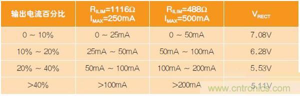 該器件系列具有動態(tài)整流器控制功能以改善負載瞬態(tài)特性(表2)。Qi標準有一個相對緩慢的全局反饋回路,最多可能需要100ms的時間來改變工作點。這意味著負載階躍會降低輸出電壓并引起系統(tǒng)復位。為了提供足夠的電壓應對瞬態(tài)變化,在低負載時需要把VRECT工作點設高。該特性有助于負載階躍,但會降低輕載效率。為解決這個問題,用動態(tài)效率調(diào)節(jié)功能來調(diào)節(jié)輕載電壓,以適應最大輸出負載。此外,還用一個電阻器來設定最大輸出電流。