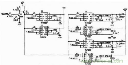 選用東芝半導(dǎo)體公司生產(chǎn)的高速光耦隔離型IGBT/MOSFET驅(qū)動(dòng)芯片TLP250.TLP250具有隔離電壓高、驅(qū)動(dòng)能力強(qiáng)、開關(guān)速度快等特點(diǎn)。驅(qū)動(dòng)電路的原理圖如圖3所示。
