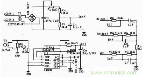 對(duì)于輸出電流取樣,本設(shè)計(jì)中使用了5 A/5 mA電流互感器。由于電流互感器的輸出為毫伏級(jí)的交流信號(hào),為了能夠被單片機(jī)內(nèi)部AD模塊采集到,必須將其整流成直流信號(hào)并加以放大。而普通二極管整流電路對(duì)毫伏級(jí)電壓是無(wú)效的,因此,此處采用了由運(yùn)算放大器(U11,LM3 58)構(gòu)成的小電壓整流電路。實(shí)際測(cè)試表明,該電路有效解決了毫伏級(jí)信號(hào)的采樣問題。