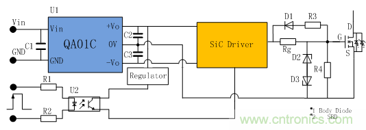 QA01C具有完整的驅(qū)動(dòng)電路推薦,通過(guò)SiC驅(qū)動(dòng)專用電源得到不對(duì)稱的正向驅(qū)動(dòng)電壓20V,負(fù)向偏置關(guān)斷電壓-4V;為了防止驅(qū)動(dòng)電壓對(duì)柵極造成損壞,增加D2和D3來(lái)吸收尖峰電壓是很有必要的。SiC驅(qū)動(dòng)器采用一般驅(qū)動(dòng)芯片即可;為了實(shí)現(xiàn)控制信號(hào)與主功率回路的隔離,需要采取隔離措施,推薦采用常見(jiàn)的光耦隔離方案。采用的光耦必須具有高共模抑制比(30KV/us)和比隔離電源大的隔離耐壓并且具有極小的延遲時(shí)間來(lái)適應(yīng)SiC Mosfet管的高頻率工作特性。