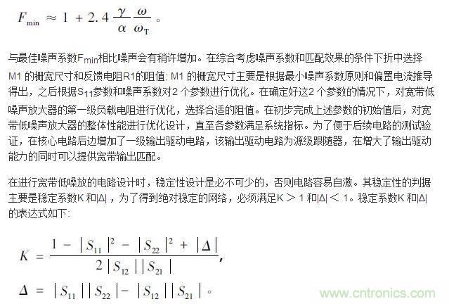 【導讀】本文給出了一種1 ~ 3 GHz 頻段的寬帶低噪聲放大器的設計,電路采用電阻負反饋結(jié)構(gòu),采用SMIC 0.18 μm RF CMOS 工藝對寬帶低噪聲放大器進行了優(yōu)化分析和仿真,結(jié)果表明在寬帶匹配、通道增益及噪聲系數(shù)方面都取得了較好的性能,對于寬帶低噪聲放大器的設計具有一定的參考價值。
