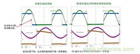 在CCM應(yīng)用中,當(dāng)初級端MOS管導(dǎo)通時,通過隔離驅(qū)動器強制使次級端MOS管關(guān)斷;當(dāng)初級端MOS管關(guān)斷, TRIG腳功能使次級端MOS管導(dǎo)通。這種交替導(dǎo)通特性大大提高系統(tǒng)能效。如圖5所示,無觸發(fā)功能的初級端和次級端驅(qū)動信號交疊的時間為40 ns,遠大于帶觸發(fā)功能的12 ns,也就是說,觸發(fā)功能將縮短延遲時間,從而降低損耗。