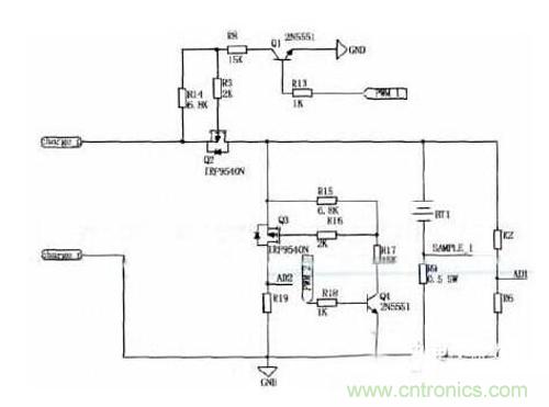 根據(jù)三路AD采樣結(jié)果確定充電器的充電狀態(tài)后,由單片機(jī)輸出兩路占空比可調(diào)頻率為1kHz的PWM波形PWM1和PWM2分別用來(lái)控制兩只三極管2N5551的導(dǎo)通程度,三極管集電極電流會(huì)隨著不同,再經(jīng)電阻分壓后提供不同的電壓給場(chǎng)效應(yīng)管的柵極,驅(qū)動(dòng)MOSFET,輸出不停大小的漏極電流Id,給蓄電池提供大小不等的充電電流和放電脈沖幅值,最終達(dá)到脈沖充電的效果。