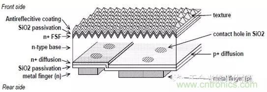 IBC(Interdigitated back contact指交叉背接觸)電池,是指電池正面無(wú)電極,正負(fù)兩極金屬柵線呈指狀交叉排列于電池背面。IBC電池最大的特點(diǎn)是PN結(jié)和金屬接觸都處于電池的背面,正面沒(méi)有金屬電極遮擋的影響因此具有更高的短路電流Jsc,同時(shí)背面可以容許較寬的金屬柵線來(lái)降低串聯(lián)電阻Rs從而提高填充因子FF;加上電池前表面場(chǎng)(Front Surface Field,F(xiàn)SF)以及良好鈍化作用帶來(lái)的開(kāi)路電壓增益,使得這種正面無(wú)遮擋的電池不僅轉(zhuǎn)換效率高,而且看上去更美觀,同時(shí),全背電極的組件更易于裝配。IBC電池是目前實(shí)現(xiàn)高效晶體硅電池的技術(shù)方向之一。