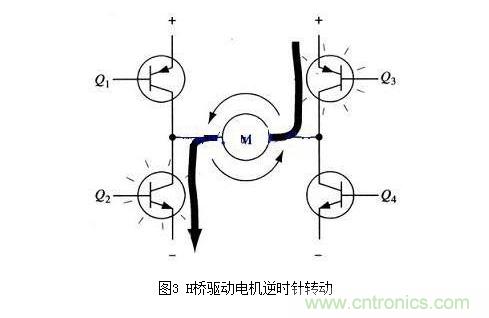 圖3所示為另一對三極管Q2和Q3導通的情況,電流將從右至左流過電機。當三極管Q2和Q3導通時,電流將從右至左流過電機,從而驅動電機沿另一方向轉動(電機周圍的箭頭表示為逆時針方向)。