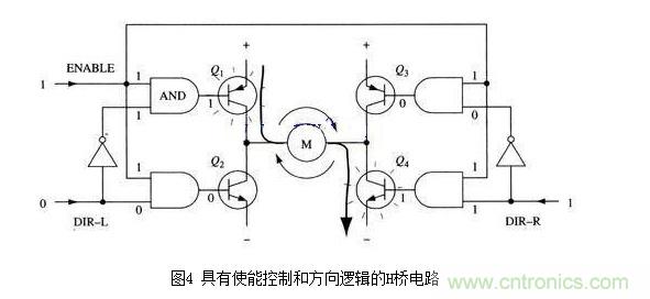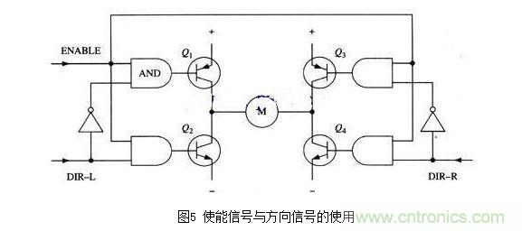 改進電路在基本H橋電路的基礎上增加了4個與門和2個非門。4個與門同一個“使能”導通信號相接,這樣,用這一個信號就能控制整個電路的開關。而2個非門通過提供一種方向輸人,可以保證任何時候在H橋的同側腿上都只有一個三極管能導通。(與本節(jié)前面的示意圖一樣,圖4所示也不是一個完整的電路圖,特別是圖中與門和三極管直接連接是不能正常工作的。)